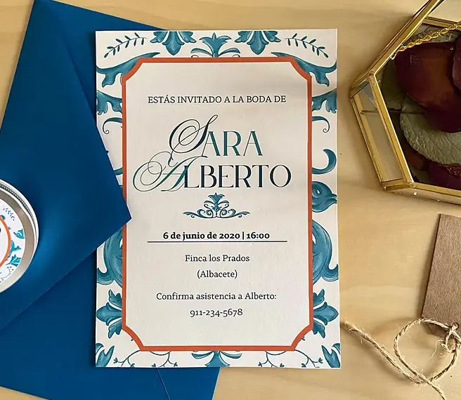 Invitación elegante en tonos azules y naranjas decorada con hojas de acanto