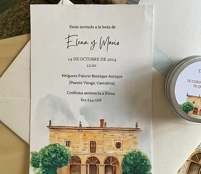 Invitación de boda sencilla con ilustración en acuarela de vuestro sitio especial